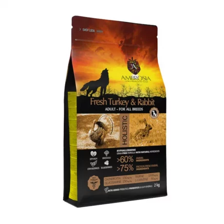 Η συνταγή μας Ambrosia Fresh Turkey and Rabbit παρέχει ένα μοναδικό μείγμα πρωτεϊνών που προέρχονται από φρέσκα φιλέτα γαλοπούλας μαζί με αφυδατωμένο κουνέλι. Περιλαμβάνει επίσης πρεβιοτικά και προβιοτικά για τη βελτίωση της πέψης και του ανοσοποιητικού συστήματος, χονδροϊτίνη και γλυκοζαμίνη για την προστασία των αρθρώσεων και ταυρίνη και L-καρνιτίνη για την ενίσχυση του καρδιομυϊκού συστήματος. Διατίθεται σε κροκέτα μεσαίου μεγέθους, ιδανική για όλες τις ράτσες σκύλων.