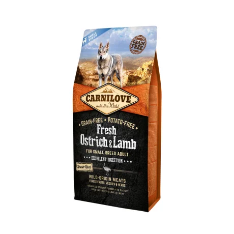 Carnilove Fresh Adult Small Ostrich & Lamb 6kg. Super premium, grain-free ξηρά τροφή για μικρόσωμους σκύλους. Με φρέσκια στρουθοκάμηλο & αρνί. Υποαλλεργική, Ω3/Ω6 για ζωτικότητα & υγιές τρίχωμα.