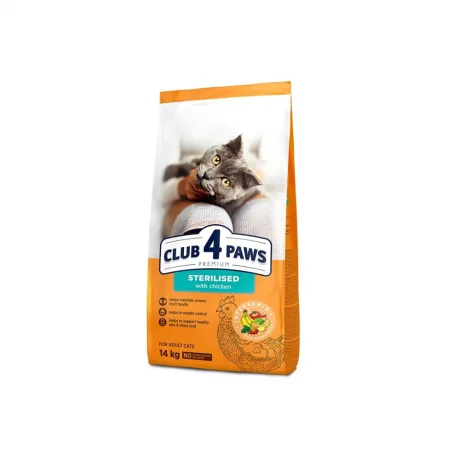 Club 4 Paws Sterilised με Κοτόπουλο 14kg: Ξηρά τροφή για στειρωμένες ενήλικες γάτες. Με κοτόπουλο, υποστηρίζει το ουροποιητικό σύστημα, βοηθά στον έλεγχο βάρους & προλαμβάνει κρυστάλλους.