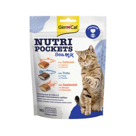 Gimcat Nutri Pockets Sea Mix 150γρ: Τραγανές λιχουδιές με κρεμώδη γέμιση, με γεύσεις σολομού, πέστροφας και γαρίδας. Εμπλουτισμένες με ταυρίνη για υγιή καρδιά και όραση.