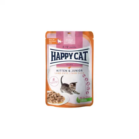 Η τροφή Happy Cat Meat in Sauce Kitten & Junior με πάπια παρασκευάζεται προσεκτικά με υψηλής ποιότητας κρέας.