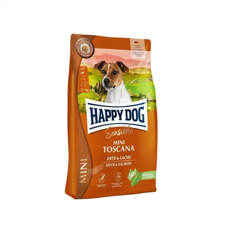 Πλήρης τροφή Happy Dog Supreme Toscana Mini 800gr για μικρόσωμους σκύλους. Μεσογειακή συνταγή με πάπια και αρνί, χαμηλά λιπαρά, ιδανική για ευαίσθητους και στειρωμένους σκύλους.