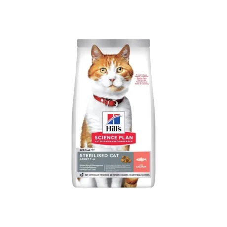 Hill's Science Plan Sterilised Cat Σολομός 3kg. Πλήρης τροφή για στειρωμένες γάτες (6 μηνών - 6 ετών). Υποστηρίζει έλεγχο βάρους και υγεία ουροποιητικού συστήματος με L-καρνιτίνη.