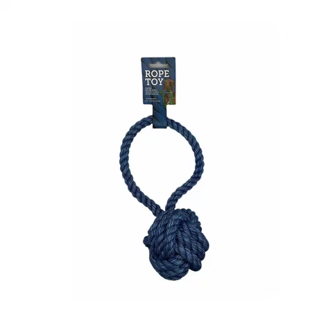 Παιχνίδι σκύλου Kowloon Μπλε Κόμπος μήκους 30cm. Διαθέτει πρακτική λαβή και μπάλα για παιχνίδια έλξης & ρίψης. Ενισχύει την υγεία των ούλων και προσφέρει απασχόληση και άσκηση.