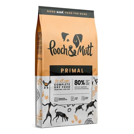 Pooch & Mutt Primal 1.5kg: Υψηλής πρωτεΐνης ξηρά τροφή χωρίς σιτηρά, με 80% κρέας (αρνί, στρουθοκάμηλος, κοτόπουλο, σολομός). Για ενήλικους σκύλους με έμφαση στη φυσική διατροφή.