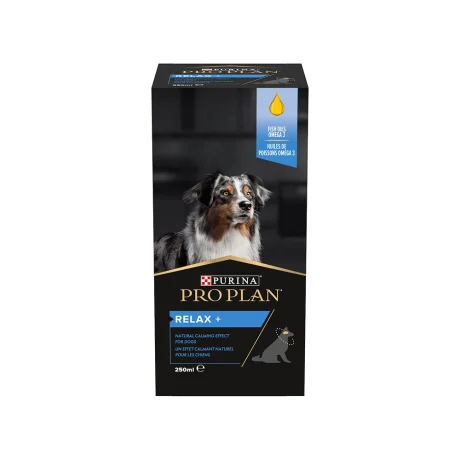 Συμπλήρωμα διατροφής Purina Pro Plan Dog Relax+ σε υγρή μορφή (250ml). Φυσική φόρμουλα με βιοενεργό μείγμα ψαριού, σχεδιασμένη να βοηθά τους σκύλους να παραμένουν ήρεμοι σε στρεσογόνες καταστάσεις.