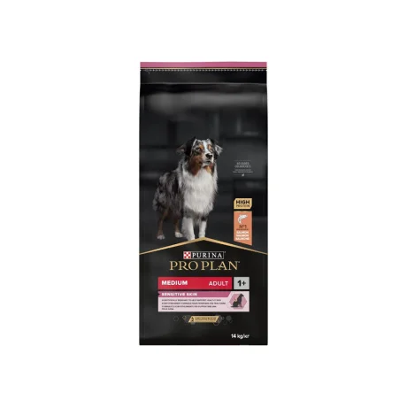 Purina Pro Plan Medium Adult Optiderma με Σολομό (14kg). Πλήρης ξηρά τροφή για ενήλικους σκύλους μεσαίων φυλών. Υποστηρίζει το ευαίσθητο δέρμα και προσφέρει υγιές, λαμπερό τρίχωμα.