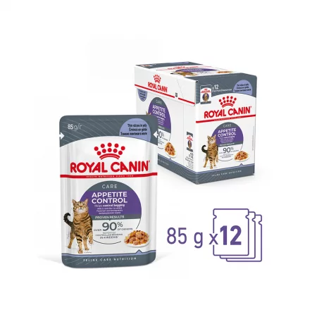 Royal Canin Wet Appetite Control Jelly 12x85gr. Πλήρης υγρή τροφή σε ζελέ για ενήλικες γάτες με τάση για υπερβολική κατανάλωση τροφής. Βοηθά στον έλεγχο της πείνας.