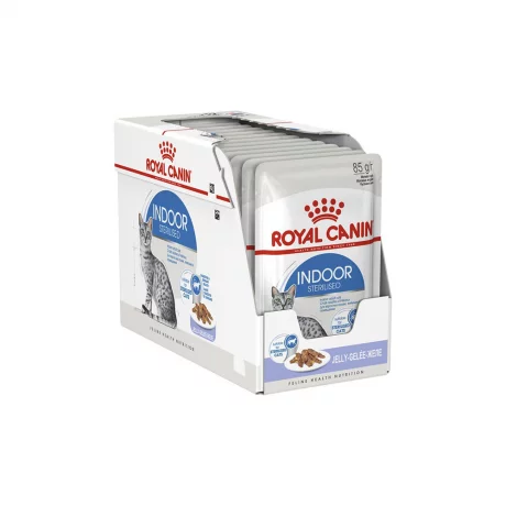 Royal Canin Wet Indoor Jelly 12x85gr. Πλήρης υγρή τροφή σε ζελέ για ενήλικες γάτες εσωτερικού χώρου. Βοηθά στη μείωση της οσμής των κοπράνων & τον έλεγχο των τριχόμπαλων.