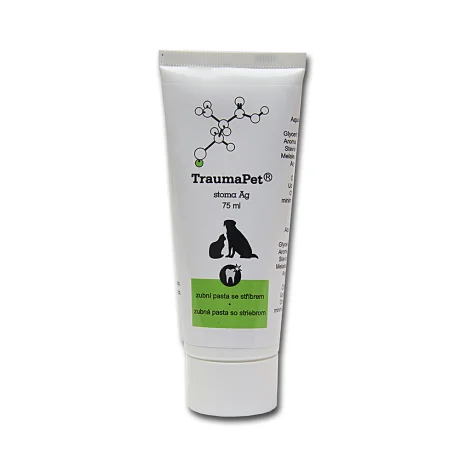Το TraumaPet stoma Ag είναι ένα κτηνιατρικό καλλυντικό προϊόν με νανοσωματίδια αργύρου για τον καθαρισμό των δοντιών των ζώων. Η λειαντική δομή βοηθά στην απομάκρυνση της πλάκας και η ήπια γεύση του κρέατος μετατρέπει τον καθαρισμό των δοντιών σε μια ευχάριστη εμπειρία. Η μακροχρόνια έρευνα και οι ειδικές εφαρμογές έχουν αποδείξει τις αντιβακτηριακές και μυκητοκτόνες δράσεις του αργύρου. Το προϊόν δεν παρουσιάζει τοξικές επιδράσεις.