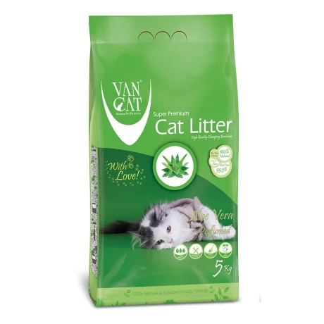 Αρωματική άμμος υγιεινής Van Cat Aloe Vera 5kg, με πολύ ψιλόκοκκη άμμο μπεντονίτη. Υψηλή απορρόφηση και αποτελεσματικός έλεγχος οσμών για καθαριότητα που διαρκεί.