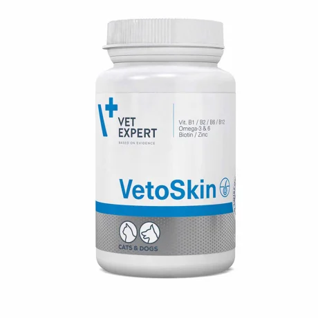 Συμπλήρωμα διατροφής Vet Expert Vetoskin σε 60 κάψουλες. Ειδική φόρμουλα για την υγεία του δέρματος και του τριχώματος σε σκύλους και γάτες. Περιέχει Ωμέγα-3, Ωμέγα-6 και βιοτίνη.